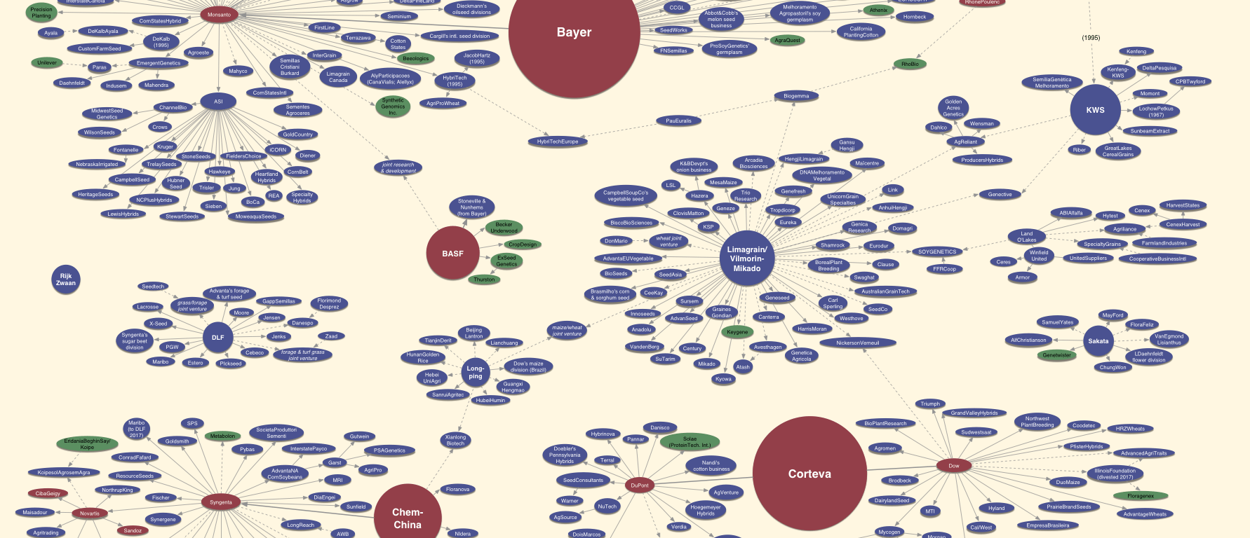 The graphic below shows ownership changes occurring from 1996 to 2018. Note that the size of the largest circles are proportional to global seed sales, which are dominated by Bayer and Corteva.