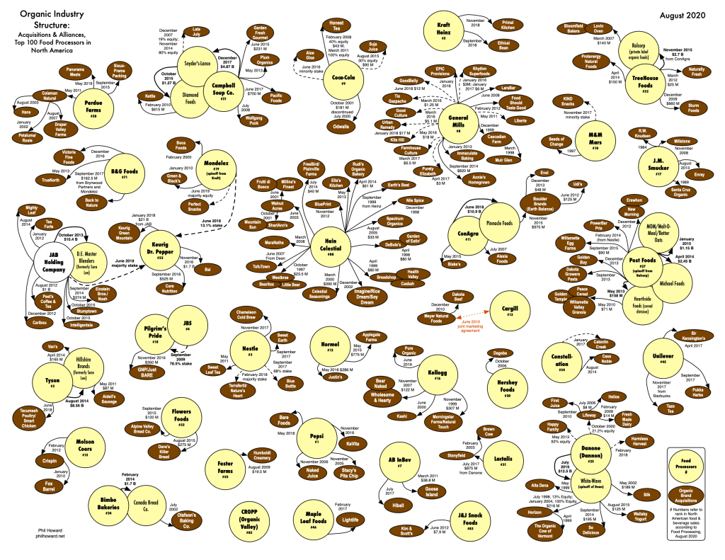 I put together the first version of this graphic in 2003, approximately a year after the USDAs national organic standard was phased in. This national standard helped to catalyze scores of acquisitions of pioneering organic brands by larger food processors and venture capitalists. These trends have only intensified, to the point that nearly all of the 30 largest processors in North America have acquired organic brands. In addition, the scale of transactions has increased, such as the acquisition of natural/organic foods giant WhiteWave by Danone for $12.5 billion (July 2016). Some processors that resisted enormous buyout offers for many years have more recently been acquired for hundreds of millions of dollars (Pacific Foods, Applegate Farms, and So Delicious/Turtle Mountain/Purely Decadent).