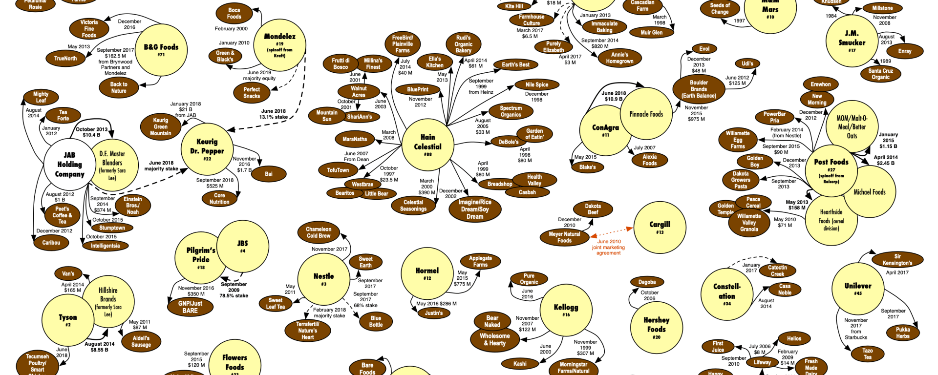 I put together the first version of this graphic in 2003, approximately a year after the USDAs national organic standard was phased in. This national standard helped to catalyze scores of acquisitions of pioneering organic brands by larger food processors and venture capitalists. These trends have only intensified, to the point that nearly all of the 30 largest processors in North America have acquired organic brands. In addition, the scale of transactions has increased, such as the acquisition of natural/organic foods giant WhiteWave by Danone for $12.5 billion (July 2016). Some processors that resisted enormous buyout offers for many years have more recently been acquired for hundreds of millions of dollars (Pacific Foods, Applegate Farms, and So Delicious/Turtle Mountain/Purely Decadent).