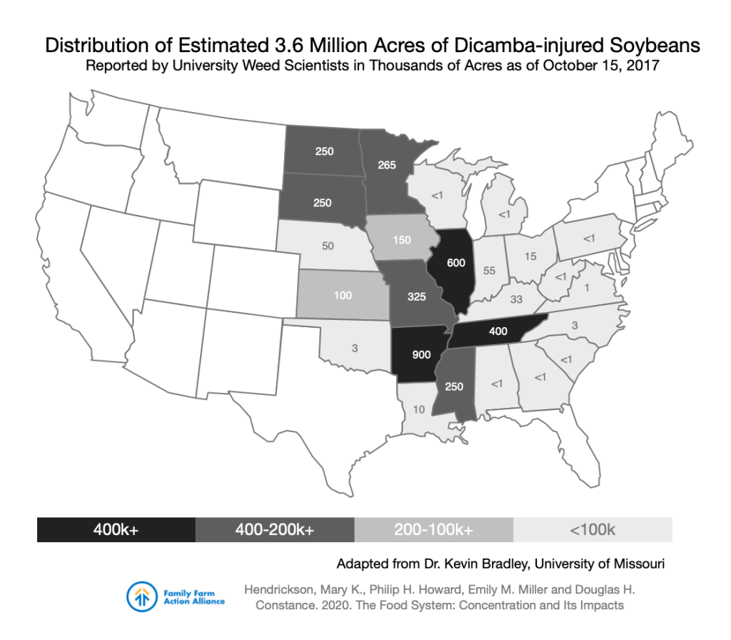 In a consolidated system, farmers, workers and the environment are interconnected, meaning that when problems hit one part, they quickly engulf others. For meatpacking, the coronavirus hit workers, and the human tragedy of over 40,000 workers with COVID-19 (189 deaths) quickly became a farm and environmental disaster. Besides the financial hit for farmers who may have euthanized between 300,000 to 800,000 hogs and 2 million chickens, the waste of the embodied resources (28,500 tons of pork, .02% of the 2018-2019 corn crop) is stunning. The inability to control the drift of the herbicide dicamba has divided communities, damaged livelihoods and ecologies, and illuminated the inability of agencies to regulate dominant firms.