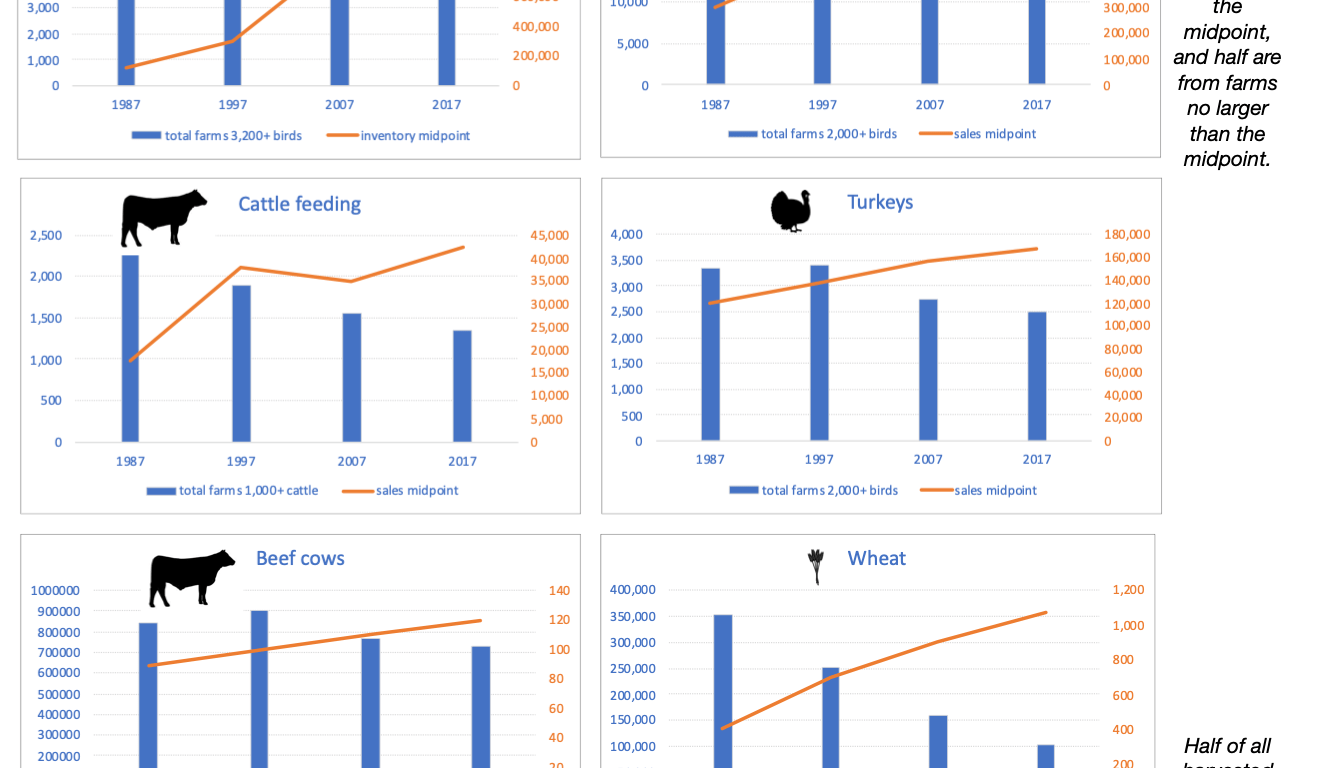 Crop acreage is consolidating in larger farms, while the sales midpoint for livestock has starkly increased between 1987-2017. For hogs, the midpoint of sales has increased from 1,200 to 51,300 and in dairy, the herd size has gone from 80 to 1,300 cows.