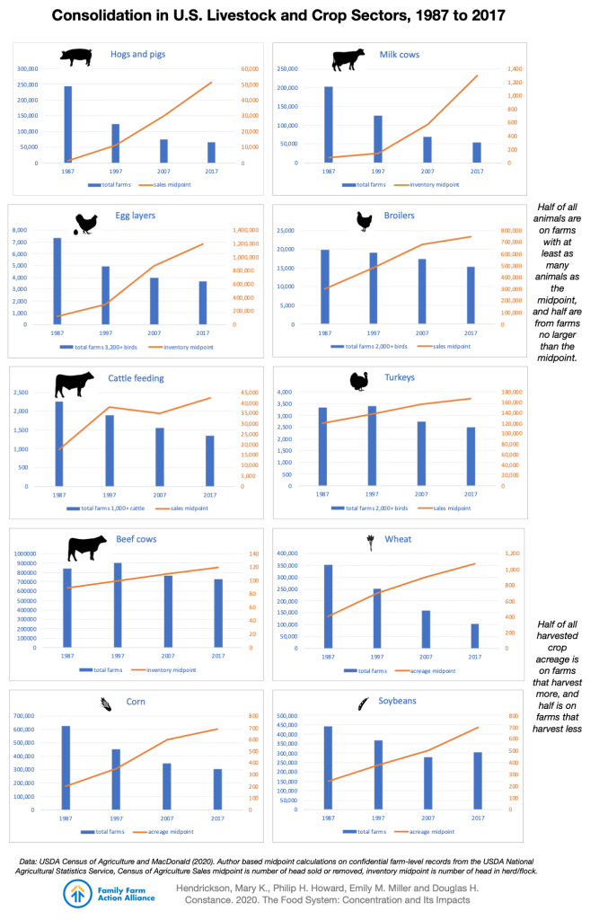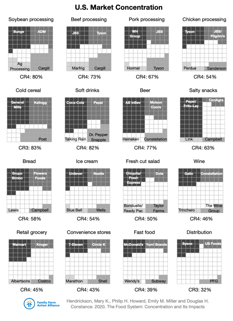 For more see: Hendrickson, Mary M., Philip H. Howard, Emily M. Miller and Douglas H. Constance. 2020. The Food System: Concentration and Its Impacts. A Special Report to the Family Farm Action Alliance.