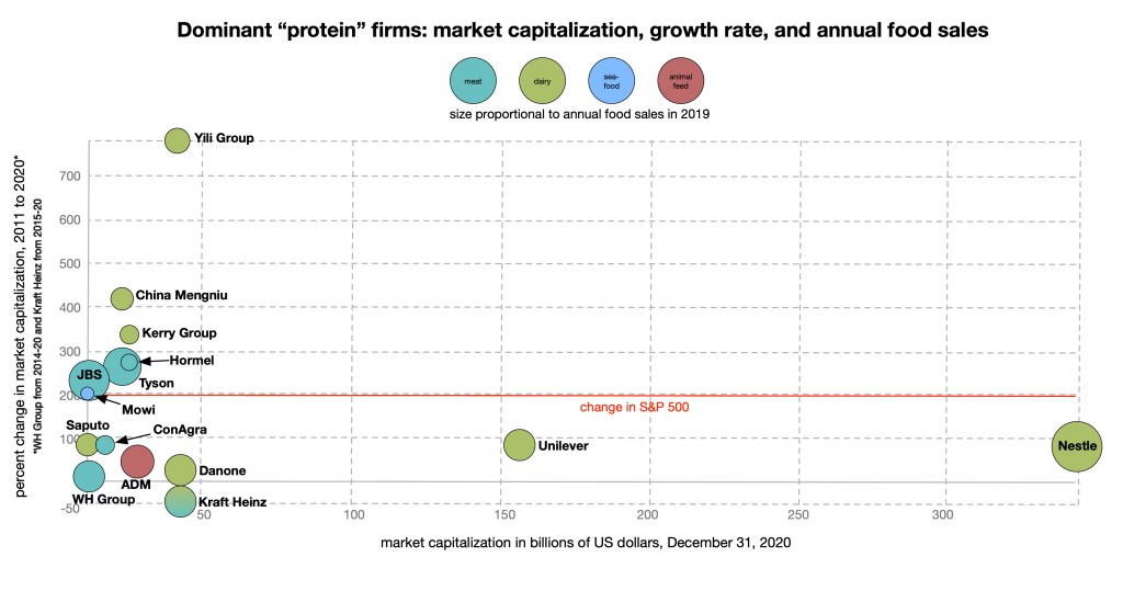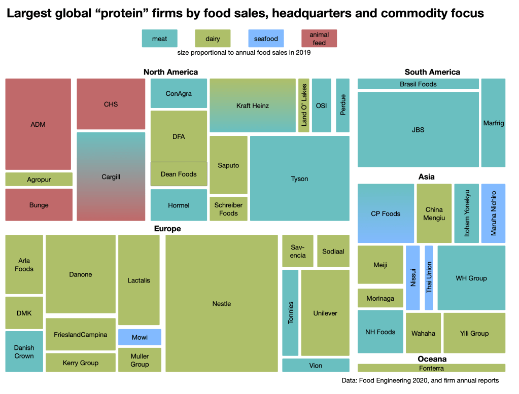 Recent years have seen the convergence of industries that focus on higher protein foods, such as meat processing firms expanding into plant-based substitutes and/or cellular meat production, and fisheries firms expanding into aquaculture. A driving force behind these changes is dominant firms seeking to increase their power relative to close competitors, including by extending beyond boundaries that pose constraints to growth. The broad banner of “protein” offers a promising space to achieve this goal, despite its nutritionally reductionist focus on a single macronutrient. Protein firm strategies to increase their dominance are likely to further diminish equity in food systems by exacerbating power asymmetries. In addition, the resilience of food systems has the potential to be weakened as these strategies tend to reduce organizational diversity, as well as the genetic diversity of livestock and crops. To better understand these changes, we visually characterize firms that are most dominant in higher protein food industries globally and their recent strategic moves. We discuss the likelihood for these trends to further jeopardize food system resilience and equity, and we make recommendations for avoiding these impacts.